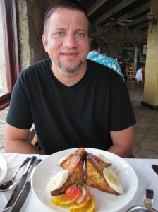 s looking entrée, & having read raving reviews about the breakfast item online before our trip- Doug decided he’d skip the buffet and order the coconut encrusted french toast. Just like every other morning, Mama Jean came dancing out of the kitchen with the dish- but this time she sat the golden brown fried bread in front of my husband. She then spent the next few minutes getting to know this happy couple from a distant land….