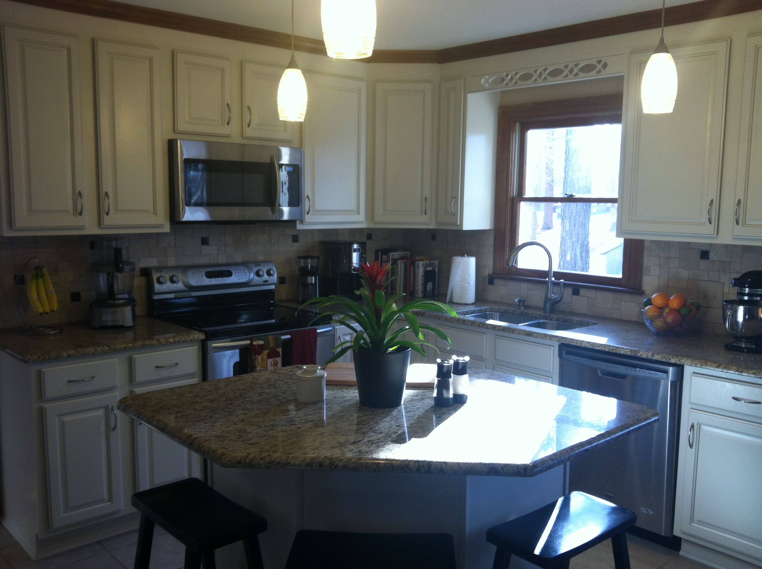 were often unaware of the mounds of dog hair, granola, coffee stains, sand and clay the kids tracked in from the backyard. It all blended into the black cabinetry and faux stone floor until we occasionally cleaned up, exposing the filth we had been living in!